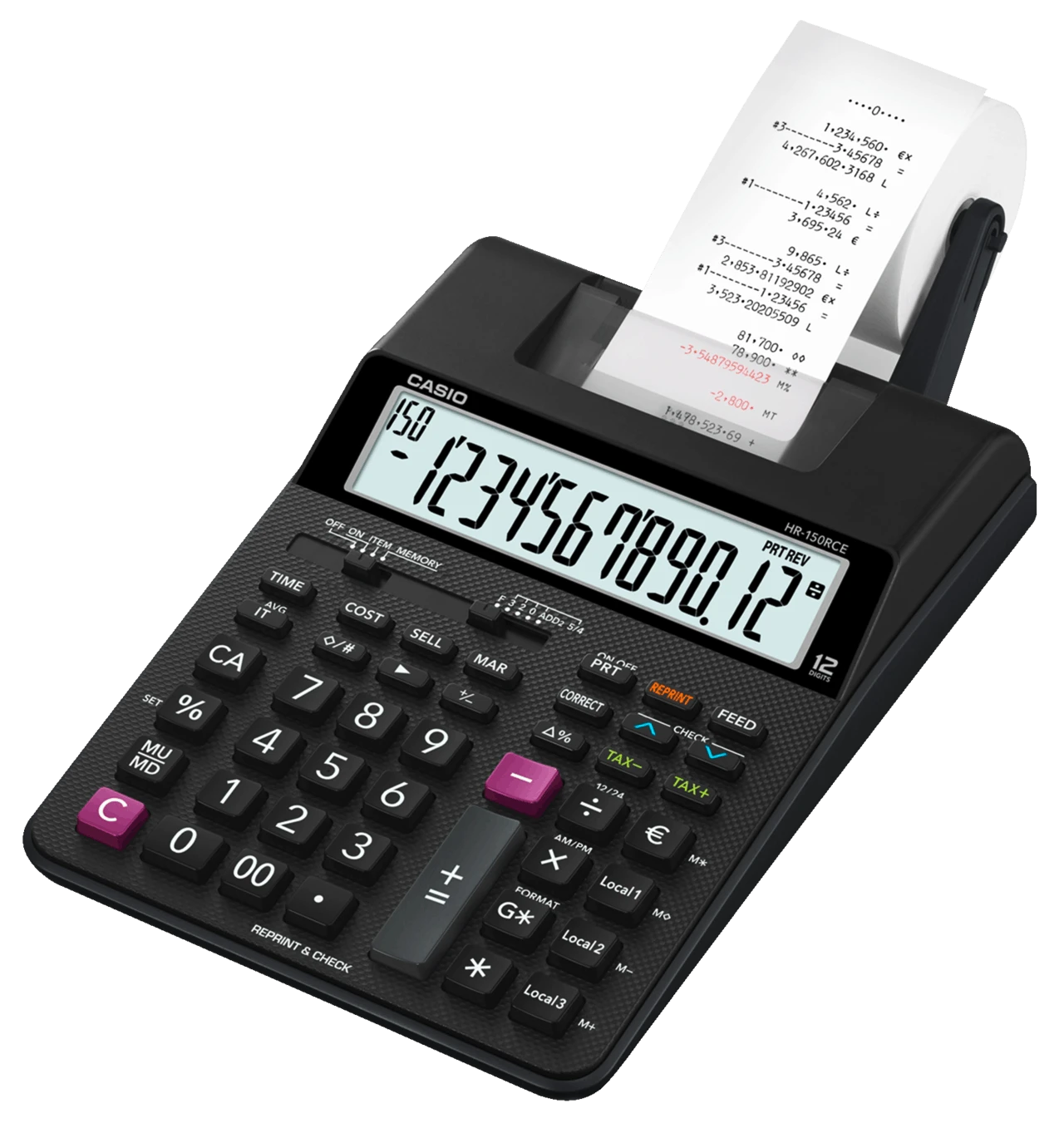 HR-8RCE Handlicher druckender Tischrechner mit Batteriebetrieb – auch für unterwegs:?12-stelliges-LC-Display. EURO-Umrechnungsfunktion.Steuer-Berechnung, Prozent-/Deltaprozentrechnung, Profitberechnungen (Cost, Sell, Margin), Rundungsautomatik(5/4), Fließ- und Festkommaberechnung, Tausender-Unterteilung, 3-Tasten Speicher, Doppelnulltaste, Check-Funktionmit 150 Schritten, After-Print- und Re-Print Funktion, Einfarb-Druck (2 Zeilen/s.). Farbwalze Gr. 744. Innen- und außenliegendePapierrollen verwendbar. Wahlweise Batterie- oder Netzbetrieb (Zubehör AD-60024). Batteriebetrieb (4 x AA Mignon). GrößeHxBxT: 4,2 x 10,2 x 20,9 cm.
