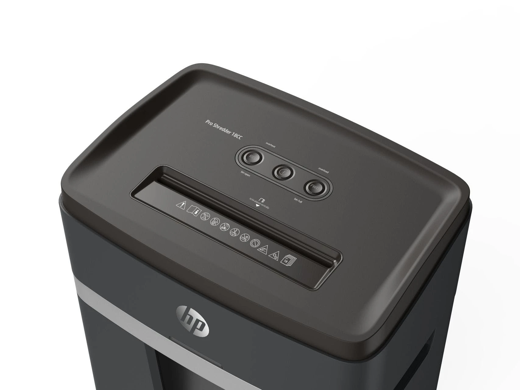 Im Cross Cut vernichtet der HP Pro Shredder 18CC mit einer Schnittleistung von 18 DIN A4-Blätter zuverlässig Ihre sensiblen Unternehmensdaten. Mit der hohen Sicherheitsstufe P-4 ausgezeichnet, schreddert der hochwertige Aktenvernichter Ihre personenbezogenen Dokumente, wie Gehaltsabrechnungen oder Arbeitsverträge, DSGVO-konform in 4 mm x 35 mm kleine Partikel. Der elegante Begleiter darf in keinem Großraumbüro fehlen und kann seinen Einsatzort dank seiner vier Rollen problemlos wechseln. Im Vergleich zu seinem kleinen Bruder aus der HP OneShred-Serie überzeugt der HP Pro Shredder 18CC mit einem besonders leisen Betriebsgeräusch von nur 55 Dezibel und einer längeren Betriebsdauer von 30 Minuten.