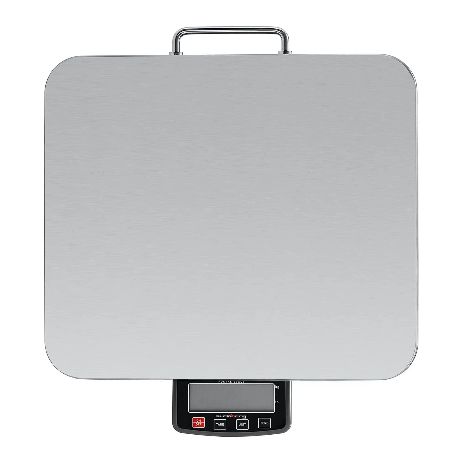 Auf der Paketwaage stimmt das GewichtMit der Paketwaage SBS-PT-100SK bekommen Sie präzise Messergebnisse, die Sie bequem über das LCD-Display am Gerät ablesen. Mit der Waage messen Sie Lasten von bis zu 100 kg bei einer Genauigkeit von 0,05 kg. Eine überlast von 150 kg darf nicht überschritten werden. Bei der Konzeption der Paketwaage wurde viel Wert auf ein kompaktes Design gelegt. Auf der Wiegefläche aus Edelstahl mit den Maßen von 345 x 405 mm finden Sie reichlich Platz für Pakete, Päckchen und viele handelsübliche Waren. Für ausgewogene Ergebnisse sorgen vier Lastsensoren, die Messergebnisse mit der Genauigkeitsklasse 4 sicher stellen. Dank der flachen Ausführung heben Sie alle Lasten mit einem geringem Kraftaufwand auf die Wiegefläche. Das Bedienfeld am Gerät ist mit einem großen LCD-Display ausgestattet, auf dem Sie die Messergebnisse jederzeit unkompliziert ablesen. Selbst aus einem ungünstigen Blickwinkel werden Sie die großen Ziffern gut erkennen. über das Tasten-Bedienfeld wählen Sie einfach und direkt die Wiegeeinheit sowie die Funktionen Tarieren und Nullsetzen. Zusätzlich verfügt die Paketwaage über eine RS232-Schnittstelle, um mit einem Computer verbunden zu werden. Technische DetailsAnzeige: LCDStromversorgung: AC Adapter + BatterieGewichtsbereich: 100 kgWiegefläche: 355 x 405 mmTarieren: JaNullen: JaEinheitenwechsel: JaDivision: 50 gStromkabel: 1,8 mBetriebsdauer Batterie: 50 hMaterial Basis: EdelstahlGenauigkeitsklasse: 4Gewichtseinheiten: kg / lbGenauigkeit/Präzision: 0,05 kgBetriebstemperatur: 1 – 40 °CMaterial Wiegefläche: EdelstahlDetails Stromversorgung: 6 AAA Batterien, Netzteil 9 VLieferumfangPaketwaage SBS-PT-100SK, Netzteil 9 V, Bedienungsanleitung