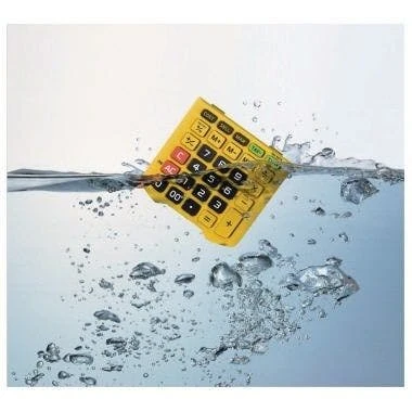 Taschenrechner mit großem LC-Display. Wasser- und staubgeschützt (Schutzgrad IP 54) und mit einem abnehmbaren und abwaschbaren Tastenfeld eignet er sich bestens für den schonungslosen Einsatz auch abseits des Büros. Neben den Standard-Funktionen beherrscht dieser Tischrechner auch Prozentrechnung (inklusive Handelsspannenberechnung), Profitberechnungen (Cost, Sell, Margin) und MwSt.-Berechnung. Außerdem besitzt er einen 3-Tasten-Speicher, eine Tausender-Unterteilung, Vorzeichenwechsel und eine Doppelnull-Taste. Solar- und Batteriebetrieb. Batterie: 1 x CR2032. Größe BxHxT: 109 x 33 x 169 mm.