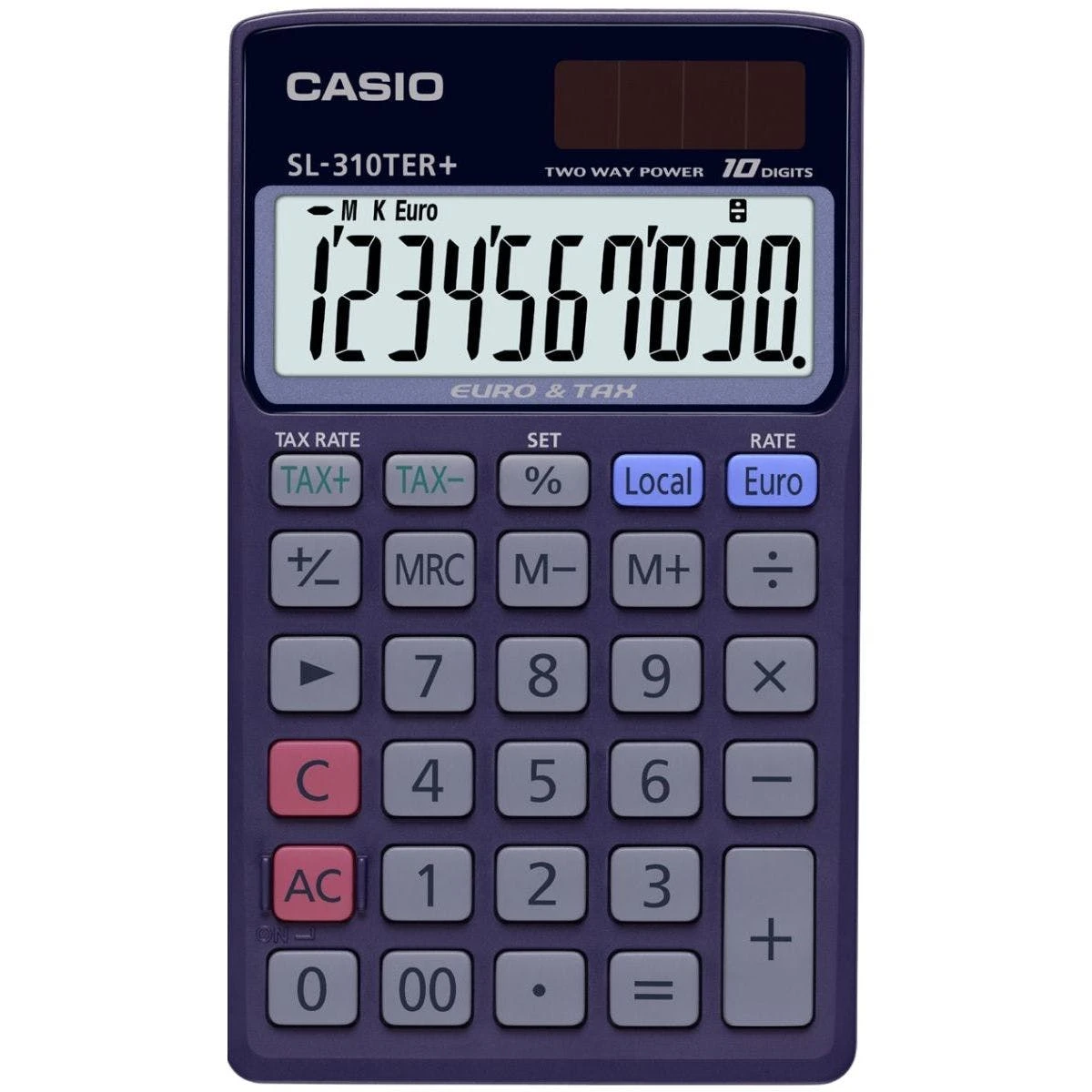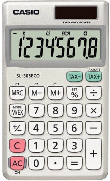 Taschenrechner SL-310TER+ · Funktionen: Prozent-Rechnung, Tausenderunterteilung, Steuerberechnung, Währungs-Umrechnung, Voll-/Konstantenspeicher · Ausstattung: Doppelnulltaste vorhanden, Vorzeichenwechseltaste · mit Plastiktasten und Schutztasche · Energieversorgung: Solar-/Batteriebetrieb · Größe (B x H x T): 70 x 8 x 118,5 mm · Masse: 50 g · 10-stelliges extra Big LC-Display · Farbe: schwarz