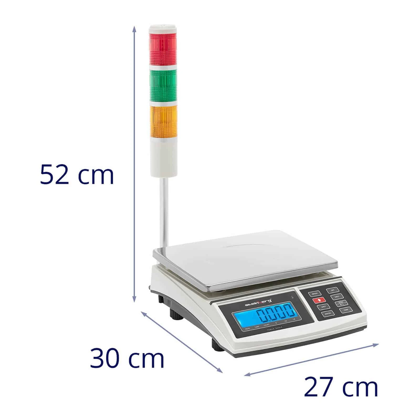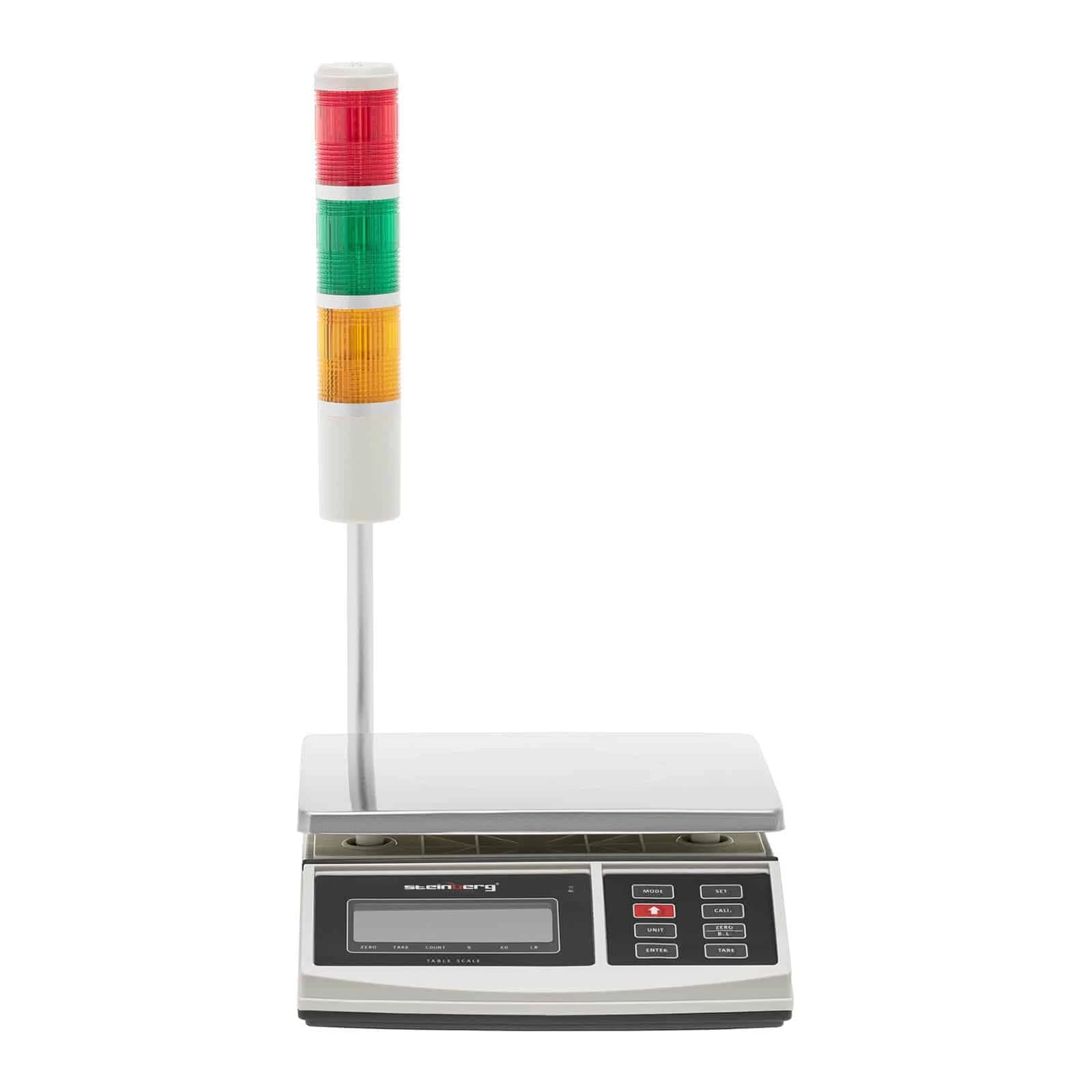 Präzise Tischwaage mit dreifarbiger LichtsäuleMit der Tischwaage SBS-TW-3C bekommen Sie präzise Messergebnisse, die Sie bequem über ein LCD-Display ablesen können. Zusätzlich zeigt eine Lichtsäule in drei Farben Grenzwerte wie Minimum oder Maximum an. Die Waage ist für eine Last von bis zu 3 kg bei einer Genauigkeit von 1 g ausgelegt. Sie eignet sich ideal zur exakten Gewichtsbestimmung von Zutaten, Postsendungen, Schrauben und vielen weiteren Dingen. Auf der Wiegefläche aus Edelstahl mit den Maßen von 210 x 270 mm finden alle handelsüblichen Waren Platz. Für eine schnelle und eindeutige Erfassung des Gewichts ist die digitale Waage an der Vorderseite mit einer hochwertigem LCDAnzeige ausgestattet. Das Display bietet dank der Hintergrundbeleuchtung ein komfortables Arbeiten auch an dunklen Einsatzorten. Zusätzlich können für das Wiegen Minimum- und Maximumwerte festgelegt werden, die über eine Lichtsäule beim über- oder Unterschreiten sichtbar gemacht werden.Technische DetailsAnzeige: LCD Material: Kunststoff (ABS), Edelstahl, KunststoffMaterial Basis: Kunststoff (ABS) Gewichtsbereich: 30000 gWiegefläche: 210 x 270 mmHöhe Ziffern: 100 mmFunktionen: Tarieren, Summieren, Zählung, Kalibrieren, Einheitenwechsel Höhe Ziffern: 27 mmHintergrundbeleuchtung: Ja Modus Prozentzählung: JaStromkabel: 1,2 mBetriebsdauer Batterie: 100 hGenauigkeitsklasse: III Gewichtseinheiten: g / lbGenauigkeit/Präzision: 1 gSichere Belastbarkeit max.: 30 kgBetriebstemperatur: 1 – 40 °CMaterial Wiegefläche: EdelstahlDetails Stromversorgung: 6-V-Akku, 4000 mAh; Adapter: Eingang: 100 V – 240 V – 0,8 Max 50/60 Hz, Ausgang: 8 V, 500 mALieferumfangTischwaage SBS-TW-30CA, Lichtsäule, Netzteil, Wiegefläche, Bedienungsanleitung